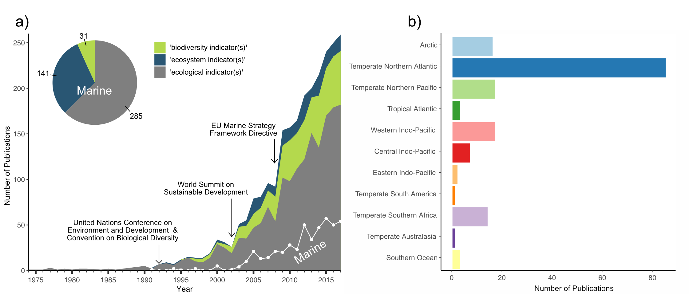 Figure 1. Bibliographic analysis of publications on biodiversity, ecological, or ecosystem indicators in general and for marine systems specifically. (A) The number of publications using one of the indicator terms [biodiversity (green shading), ecosystem (blue shading), or ecological (gray shading) indicator(s)] between 1975 and 2017 (total of 2502), and the number of publications using these terms in relation to marine systems only (white trend line; total of 457), shown in relation to the years when three significant international or regional legislative frameworks were implemented. (B) The geographic distribution of a subset of 1430 publications across marine ecoregions (Spalding et al., 2007), extracted from publication abstracts and keywords. The bibliographic data were queried from the Web of Science database (accessed last Sept 18th, 2018). Figure modified from McQuatters-Gollop et al. 2019.