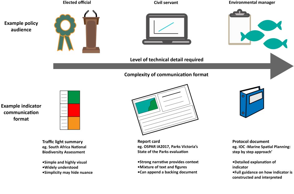 Figure 2. Indicator communication formats should vary in level of technical detail depending on the policy audience. Figure modified from McQuatters-Gollop et al. 2019.