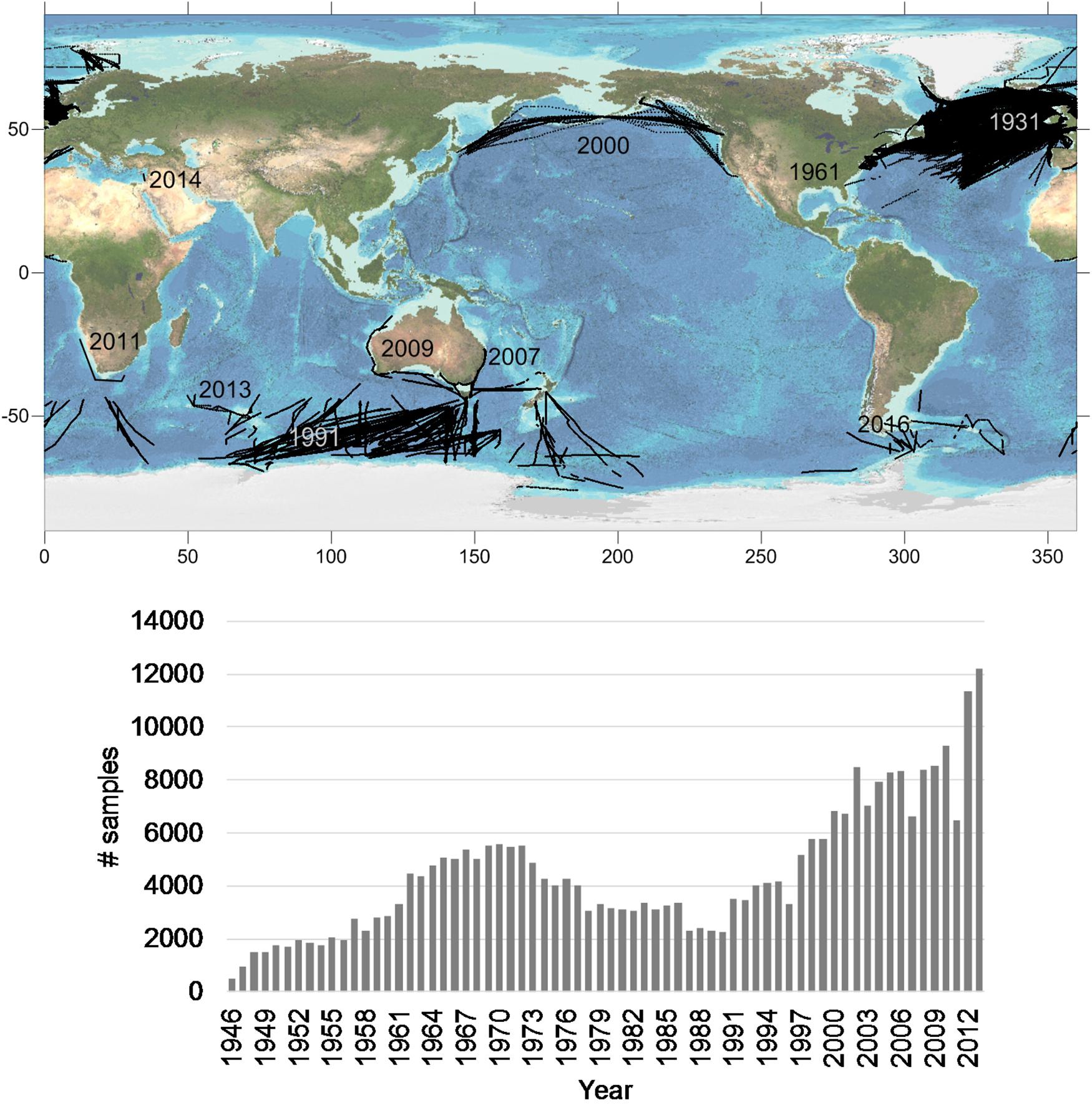 When most people think of biodiversity they think of iconic habitats like rainforests and coral reefs. Much of the ocean’s biodiversity, however, is too small to see without a microscope. Plankton are one of the most diverse groups of organisms on the planet. Critically, they underpin the marine foodweb and produce 50% of global oxygen – one out of every two breaths we take is produced by marine plankton. Plankton also respond quickly to environmental change and they aren’t widely fished. These features make plankton ideal indicators for ecosystem assessments to inform decision-making. To use plankton to inform decisions, however, extensive data are required. The Continuous Plankton Recorder (CPR) survey is unique amongst marine biological datasets in that the North Atlantic survey spans nearly 90 years, with the CPR network now including surveys in the Southern Ocean, Australia, the North Pacific, and New Zealand. Although not quite global in scale (yet!), the CPR survey is world’s longest and most spatially-extensive marine ecological dataset.