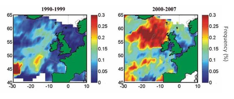 The percent frequency of occurrence of coccolithophores on CPR samples has increased during the 1990s and 2000s.